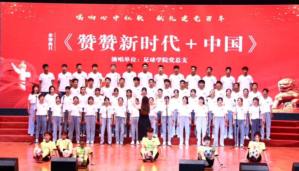 足球学院师生合唱《中国》、《赞赞新时代》两首曲目,用朴实的歌词,激昂的旋律,唱出了对祖国母亲的热爱。