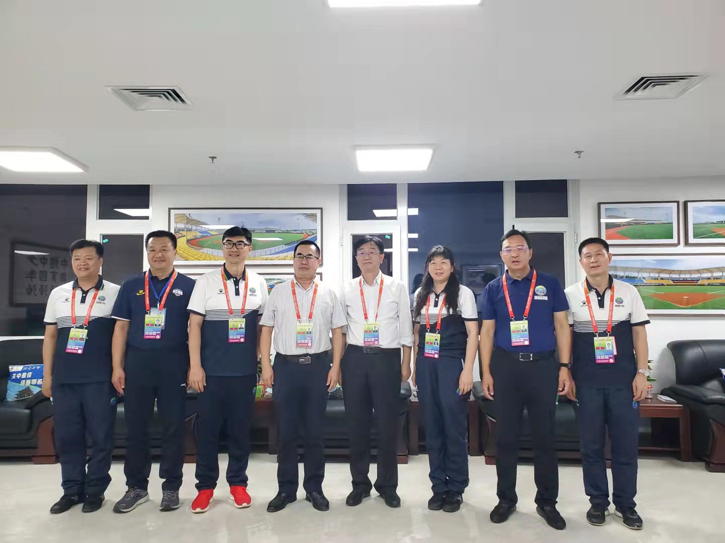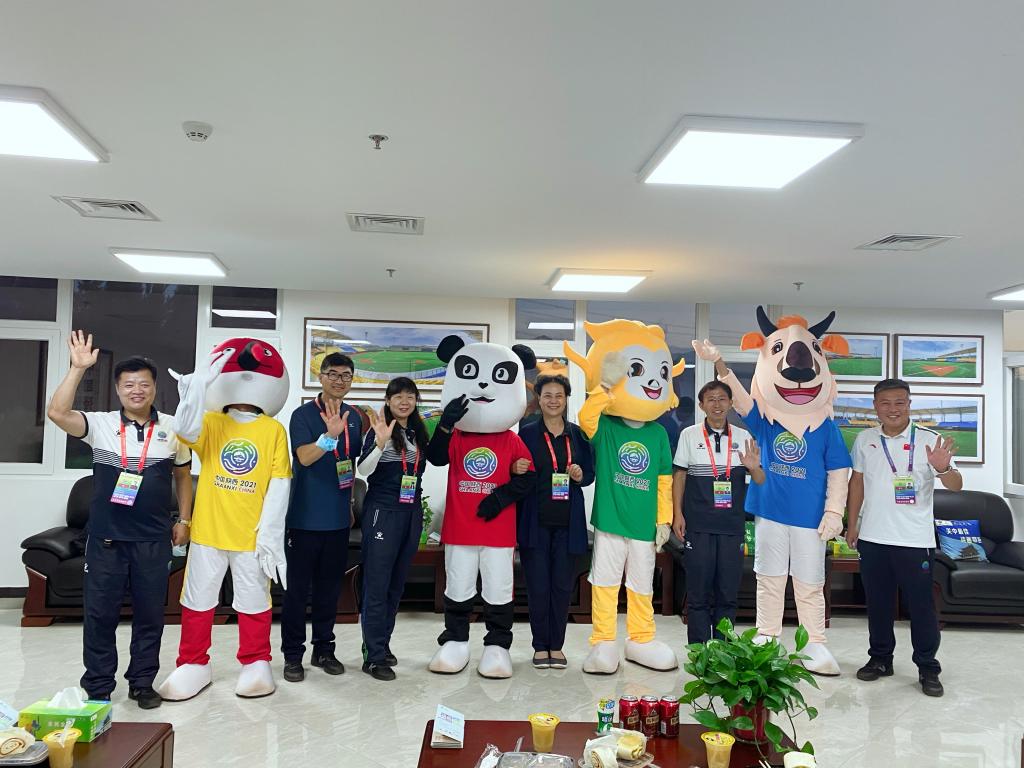棒球项目竞委会执行副主任王志刚,棒球项目竞委会执行主任陈旭,棒球项目竞委会执行主任赵军,国家体育总局手曲棒垒球管理中心党委书记陈岩,国家体育总局手曲棒垒球管理中心副主任、中国垒球协会主席杨旭,中国垒球协会副秘书长郑璐和十四运会吉祥物合影