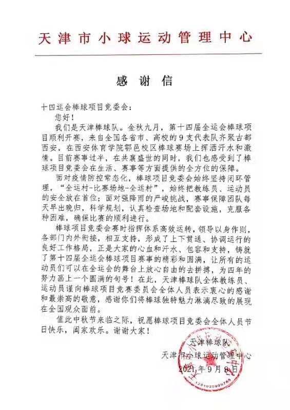 天津市小球运动管理中心向棒球项目竞委会发来感谢信