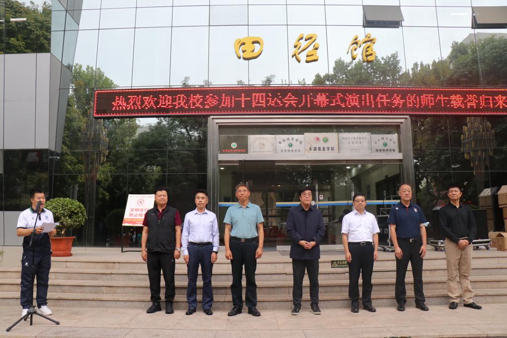 本网讯 9月16日下午,我校在田径综合馆前举行隆重欢迎仪式,迎接参与十四运会开幕式演出师生载誉归来。校党委书记黄道峻,校长刘子实,党委副书记文立新,党委委员、党委宣传(统战)部部长张朝阳及相关职能部门领导出席欢迎仪式。