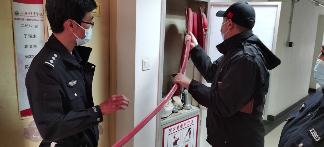 为了增强活动的针对性和实效性,保卫处于日前联合图书馆对教职工进行了应急疏散演练活动,在鄠邑校区进行了反恐防暴演练活动,还与红缨路派出所干警一同对含光校区图书馆、教学场馆、学生公寓、学生食堂等场所进行了消防安全大检查。