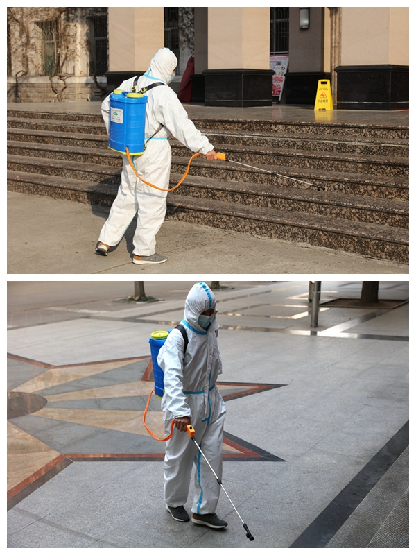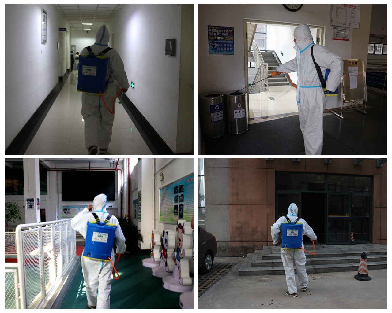 工作人员对教学楼、各场馆、食堂、宿舍楼等区域进行多次防疫消杀工作。