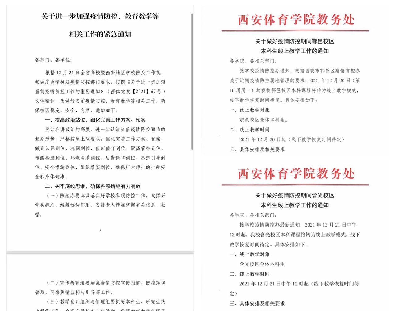 学校疫情防控工作领导小组、学工部、教务处等单位先后发布《关于切实做好当前疫情防控工作的紧急通知》、《关于进一步加强学生疫情防控的通知》、《关于进一步加强疫情防控、教育教学等相关工作的紧急通知》、《关于做好疫情防控期间鄠邑校区本科生线上教学工作的通知》、《关于做好疫情防控期间含光校区本科生线上教学工作的通知》等。