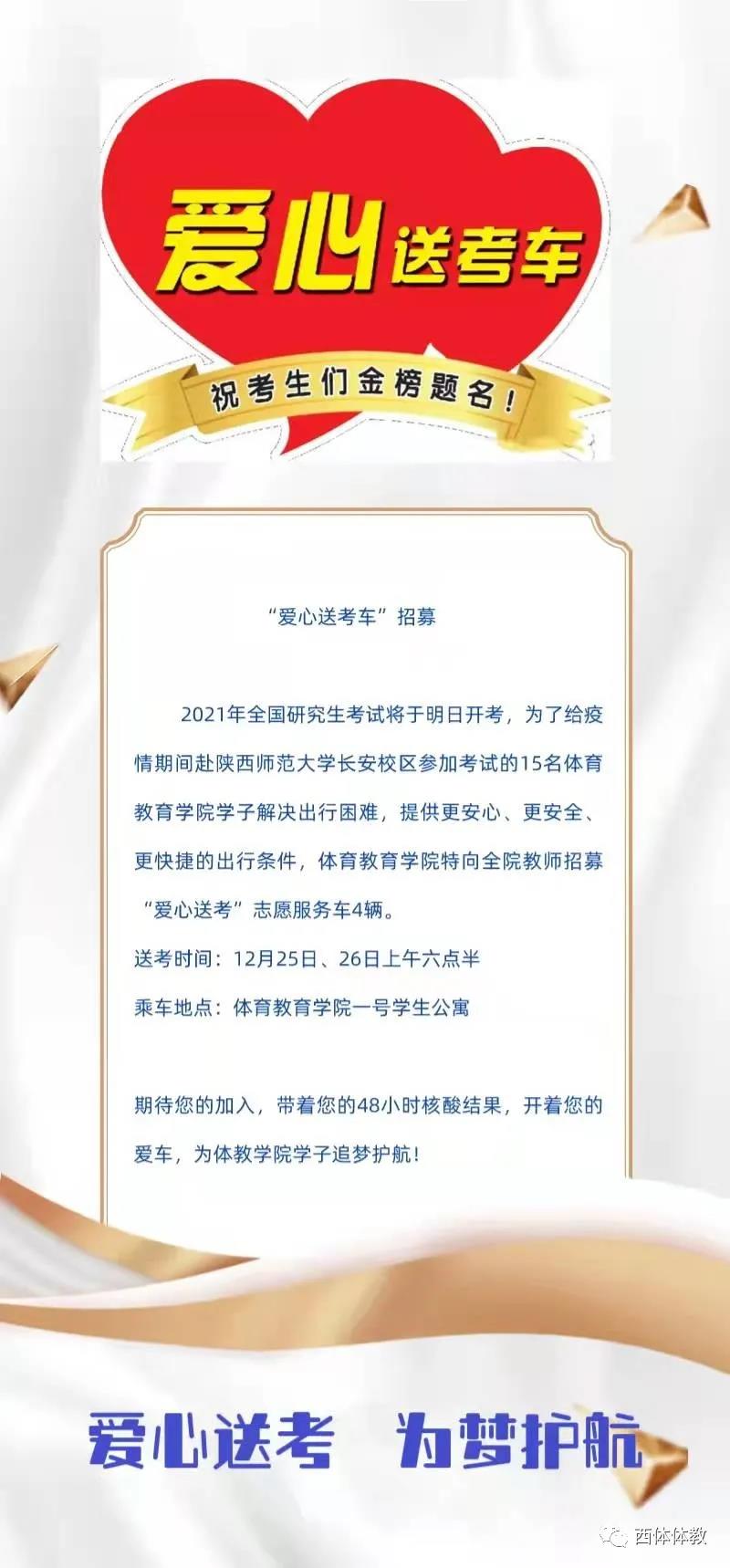 2022年研究生招生考试于12月25日举行,按照“应考尽考”的要求,在疫情防控特殊时期,为确保体育教育学院15名大四报考外校学生更安心、更安全、更快捷地到达考场,顺利参加研究生考试,学院党委副书记李倩制作了电子海报,在体育教育学院教工微信群发起了“爱心送考”志愿车招募。消息发出去后,支部书记耿莉第一个回应“我不会开车,但可以提供车”。支部书记殷剑侠发来消息——“几点出发,我要跟小区门卫打招呼”, “我要参加研究生监考,送考早走一点能赶回来”,体操教研室主任冯俊彦悄悄发来私信。随即,“我有车,可以坐5人”“我有车,6座”“我的车可以坐3人”“我的车愿提供”“我在隔离,但可以用我的车”“我愿意当司机”——群里沸腾了,教师们积极响应,踊跃报名。居家隔离的教研室主任郁成刚、马文新、支部书记杨辉、前教研室主任于新彦、教师刘占锋,核酸检测未出结果的前教研室主任万秦华老师、赵艳明老师,或热心地提出爱车供送考使用,或因无法送考而表示遗憾。有研究生监考任务的教研室主任宋红生,不但积极提供车辆,还立即自行联络了前支部书记陈宏力老师担任司机。最可爱的插曲是,2019级同学们从辅导员处得知此事,也申请骑摩托送学长学姐去赶考……志愿车招募结束后,李倩随即对确定的爱心送考教师陈宏力、殷剑侠、张大千等几位老师的核酸检测情况、车辆情况、是否有出小区证明,是否有本部出入证等情况一一核实,以确保送考工作顺利无误。