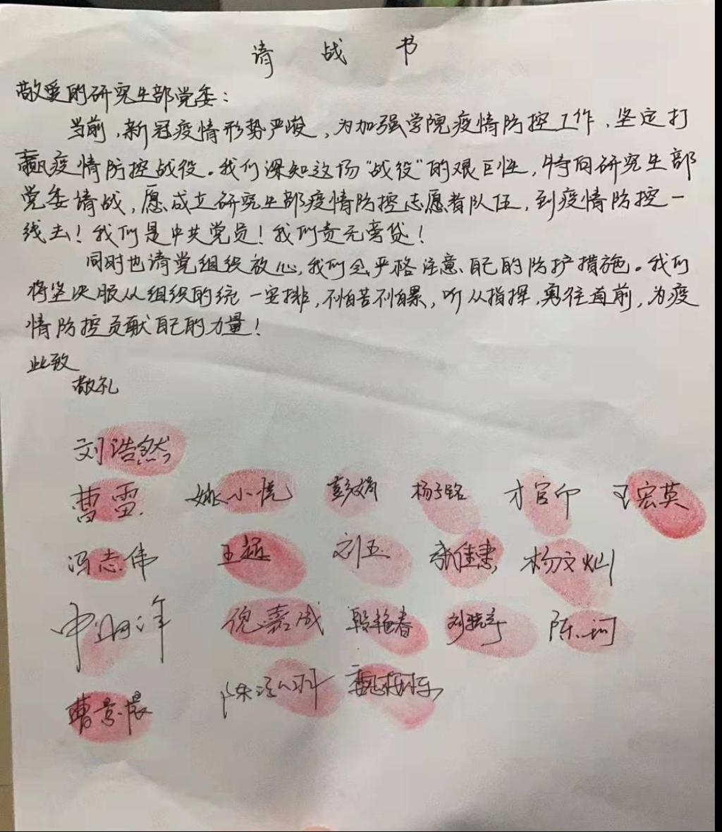 研究生部党员学生以身作则,把为人民服务的党员宣誓誓词牢牢的记在了心中,连夜递交了一份又一份的请战书,参加到学校的志愿活动中贡献自己的力量,成为最美逆行者。