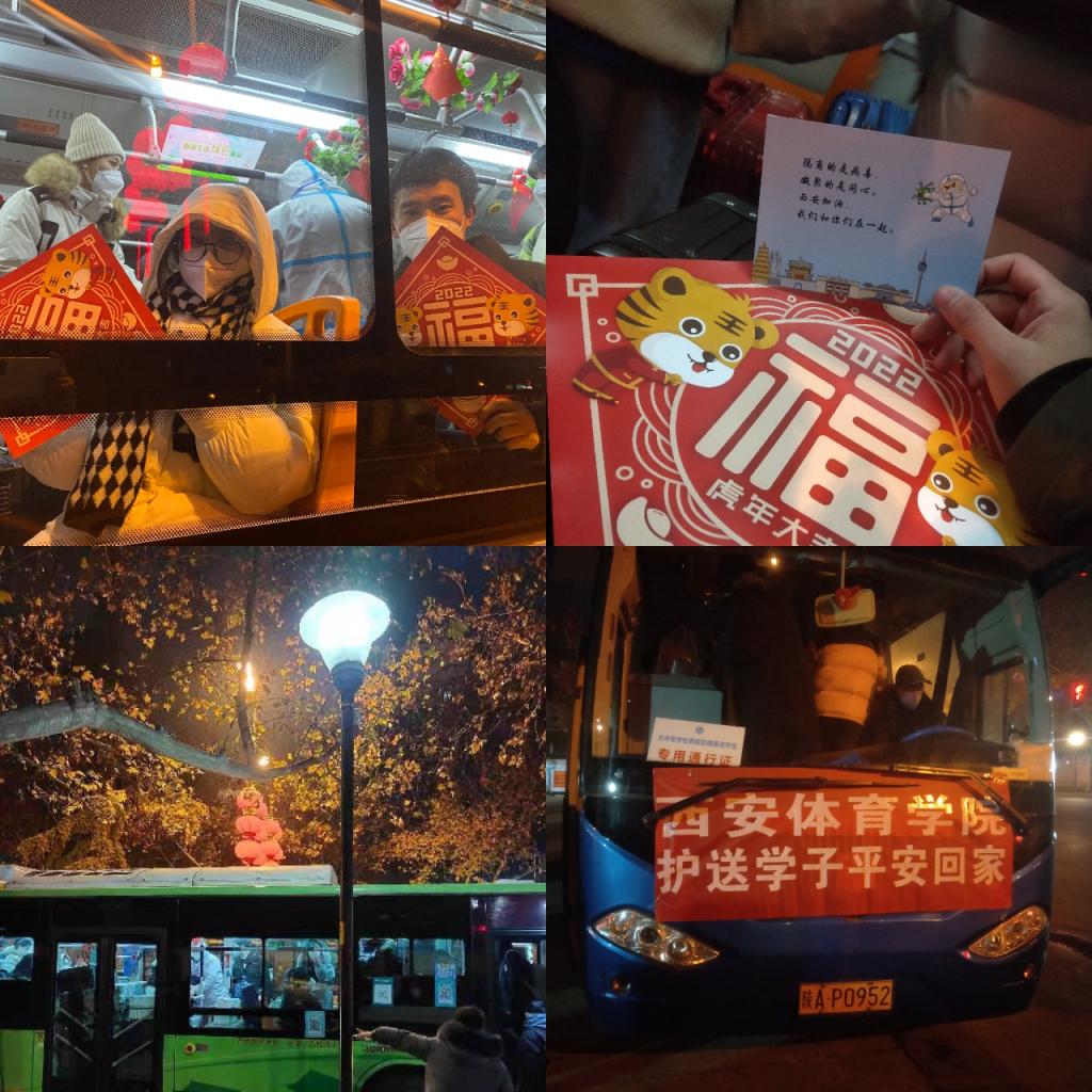 突如其来的疫情打破一切本该美好的生活状态,让我们进入紧张的阶段,本来已经抱着在校过年的心态了,但是后来疫情有所缓解碑林区降为低风险,学校为了我们能够返乡过年,组织并安排大巴车送我们到机场、火车站和高铁站,这样不仅让我们不再去接触其他校外不安全的环境,避免了很多事情的发生,22号23号凌晨都有老师和志愿者在等待同学走上回家的道路,在大巴车前会贴有“西安体育学院护送学子回家”的字样,让同学们看到都能感到温暖。老师会给我们发n95口罩和酒精湿巾等防疫物品,让我们在返乡途中保证安全。特别感谢学校能这样做,让我们学子开开心心安安全全的回家过年,在这里祝学校全体师生假期愉快新的一年事事顺利!