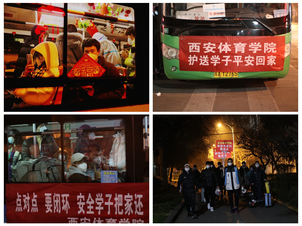 由于疫情的影响,原本已经做好了在学校过年的准备,出乎预料又值得庆幸的是,自1月21日起,碑林区辖区无封控区,全域为低风险。1月22日校本部开始放假。为确保我们能够顺利返乡,学校多方协调,安排大巴送我们回家,并实行“点对点”“闭环式”将我们送至两站一场。在此之前,学校还向我们发放N95口罩、消毒纸巾等防疫物品,保证我们返乡途中的健康安全。我看到放假乘车安排文件上,凌晨三点半就开始发车,在学校门口看见领导、老师和志愿者们为大家顺利返乡忙碌的身影,公交车上“西安体育学院护送学子平安回家”字样的横幅,心里对回家的期待慢慢变成了感动和感恩 感谢学校为我们在封校期间安排的一切,守护着我们的一切。谢谢您,我的西体!