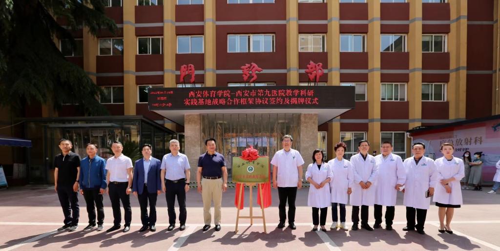 本网讯 为促进毕业生充分高质量就业,服务陕西体医融合事业发展,5月19日,我校与西安市第九医院签署战略合作框架协议并举行揭牌仪式。西安市第九医院党政领导班子及部分职能科室负责人、我校副校长陈彦教授出席,教务处、运动与健康科学学院负责人参加了签约仪式。仪式由市九院党委书记郑菊贤主持。