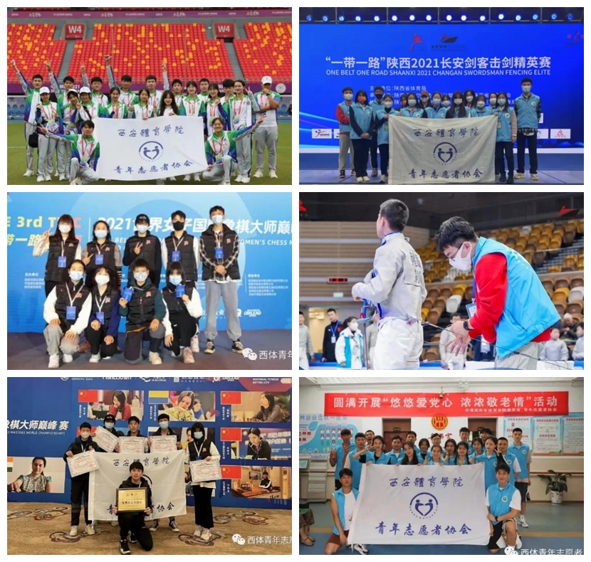 我校青年志愿者协会自成立以来,在学校党委的领导下,在校团委的指导下,秉承“奉献、友爱、互助、进步”的志愿精神,常态化开展疫情防控、义务支教、尊老敬老、帮孤助残、环境保护、禁毒防艾等一系列志愿服务活动,引导西体青年积极参加社会公益服务。特别是2021年面对“家门口”的十四运会及残特奥会、“一带一路”系列赛等大型赛事,我校青协积极承担多项志愿服务工作,志愿者们吃苦耐劳,挥洒汗水为赛事增光添彩。在社区敬老活动、社区便民服务、关爱残障人士等温馨扶弱、阳光助残活动中,志愿者们以百分之百的爱心与耐心,为服务对象带去温暖。年底面对来势汹汹的新冠疫情,可爱的“小蓝们”为师生筑起校园安全的疫情防线。