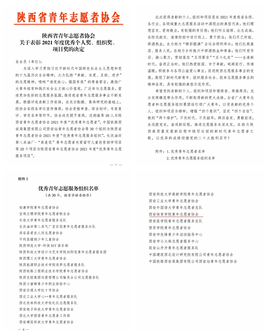 本网讯 为激励广大青年培育和践行社会主义核心价值观,广泛参与志愿服务,营造更加良好的志愿服务氛围,推进青年志愿服务事业不断发展,日前,陕西青年志愿者协会发布《关于表彰2021年度优秀个人奖、组织奖、项目奖的决定》,我校青年志愿者协会榜上有名,与其他29个组织一同获得2021年度“优秀青年志愿服务组织”。