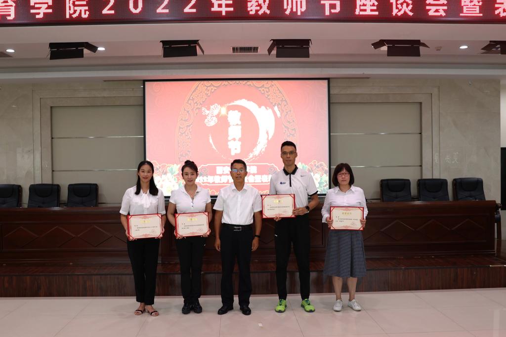 副校长陈彦为被评为陕西省第十七届省运会足球大学生乙组优秀教练员的宋辉、张雁飞、王莎莎、马俊和被评为2022年中国飞盘联赛优秀教练员的孙京主颁发荣誉证书。