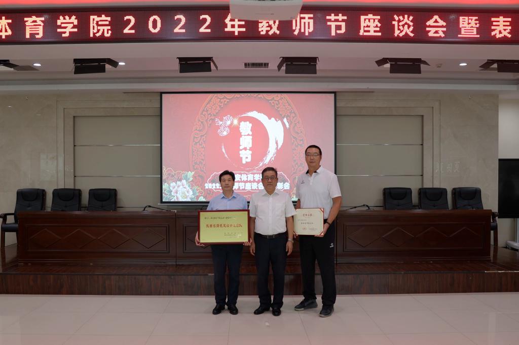 党委副书记高玉峰为获得陕西省师德先进个人的教师李国华和陕西省师德建设示范团队运动与健康科学学院颁发荣誉证书和奖牌。