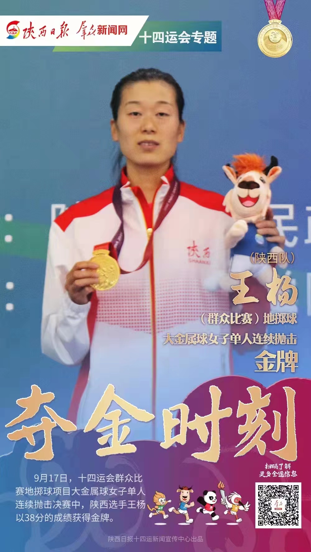 2021年中华人民共和国第十四届运动会群众比赛地掷球决赛中,王杨为陕西代表团获得开幕式后陕西省群众比赛项目首金。