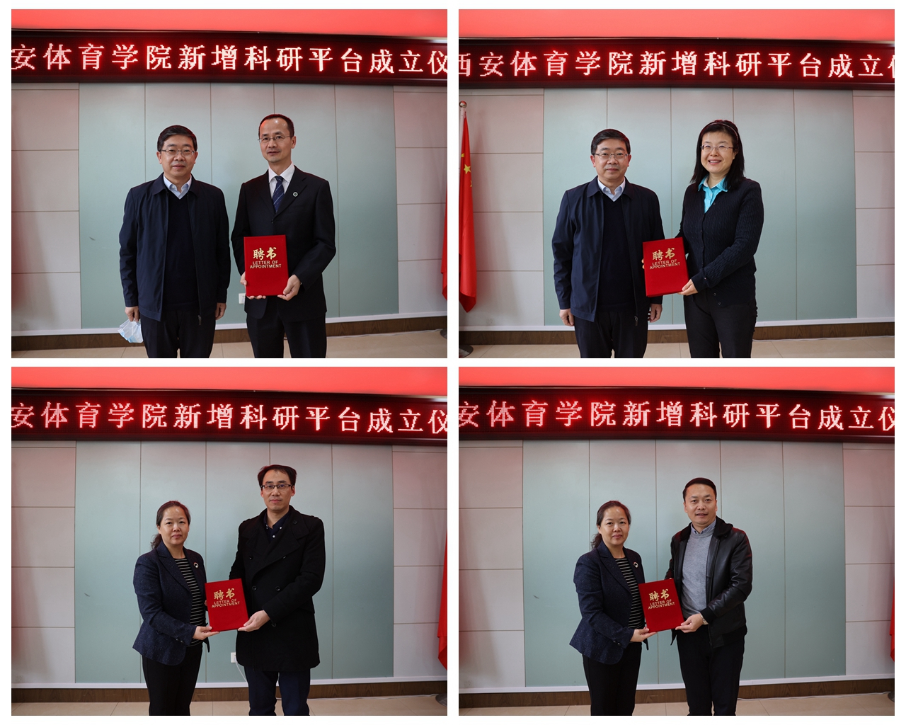 刘子实为苟波颁发“国家体育总局科普基地负责人”聘书,为潘玮敏颁发“陕西省高校工程研究中心主任”和“西安体育学院体育工程装备研究院执行院长”聘书。谢英为陕西省高校工程研究中心技术委员会主任王刚、副主任马海涛、杨少毅、穆鹏远和发展委员会主任刘涛颁发聘书,并为“西安体育学院体育工程装备研究院”揭牌。