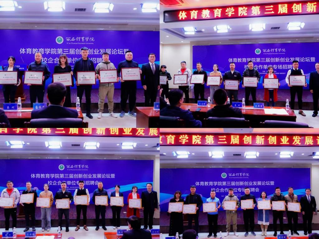 体育教育学院院长马海涛宣读了新建校企合作创新创业基地和指导教师名单并举行了授牌仪式。高月宏、马海涛分别为西安海之源金融科技有限公司、创聚冰雪陕西国际体育之窗、西安常住体育运动管理有限公司、陕西力唤文化体育有限公司、时力运动等公司一一授牌。活动同时为朴国光、牟亦玮等16位企业嘉宾颁发了创新创业校外导师聘书。高峰、杨锦春等6位嘉宾分享了自己工作经历与从业创业心得。