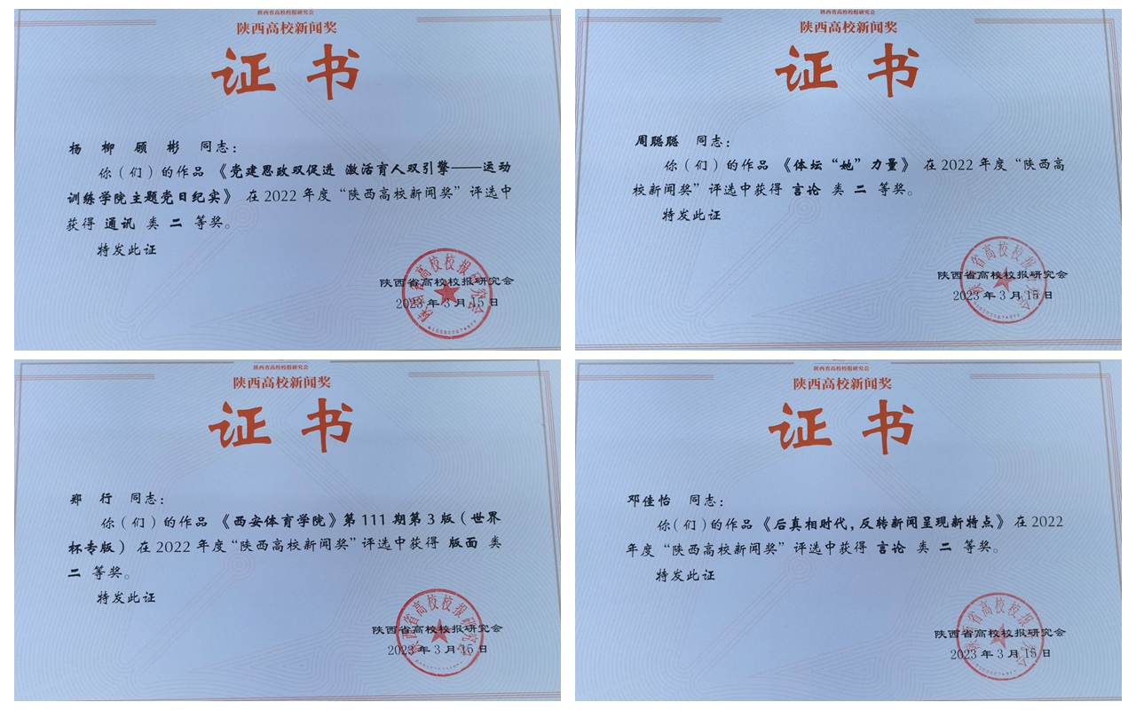 本网讯 近日,2022年度“陕西高校新闻奖”评选结果揭晓。我校共4件作品获奖。其中杨柳、顾彬采写的《党建思政双促进,激活育人新引擎——运动训练学院主题党日纪实》获通讯类二等奖;邓佳怡撰写的《后真相时代,反转新闻呈现新特点》后真相时代,反转新闻呈现新特点获言论类二等奖;周聪聪撰写的《体坛“她”力量》体坛“她”力量获言论类二等奖;雷天纵、周聪、郑行撰文,郑行编辑的《第111期第3版(世界杯专版)》第111期第3版(世界杯专版)获版面类二等奖。