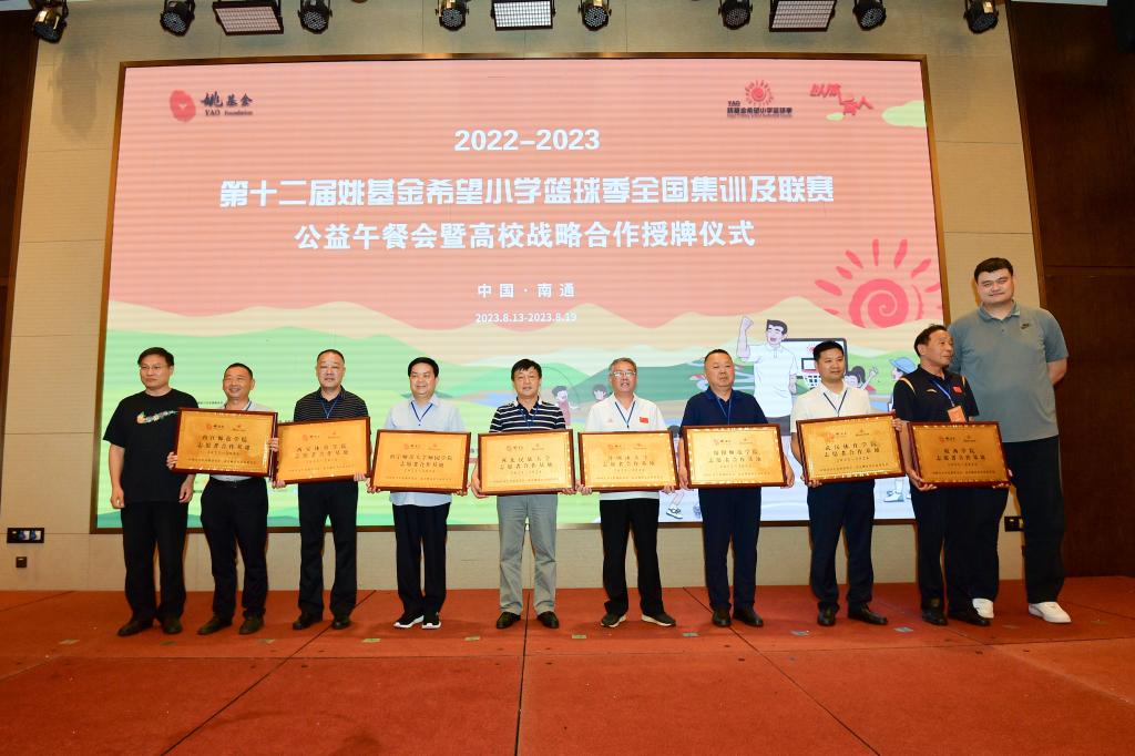 本网讯 2022—2023第十二届姚基金希望小学篮球季全国集训及联赛8月13日—18日在江苏南通举行。校党委委员、党委宣传部部长张朝阳18日出席合作高校战略合作协议授牌仪式,并代表学校接受姚基金创始人、中国篮协主席姚明先生的授牌,全国仅八所高校获此殊荣。这也标志着下一个五年,姚基金将继续与我校合作,共同致力于乡村体育教育,助力乡村振兴。