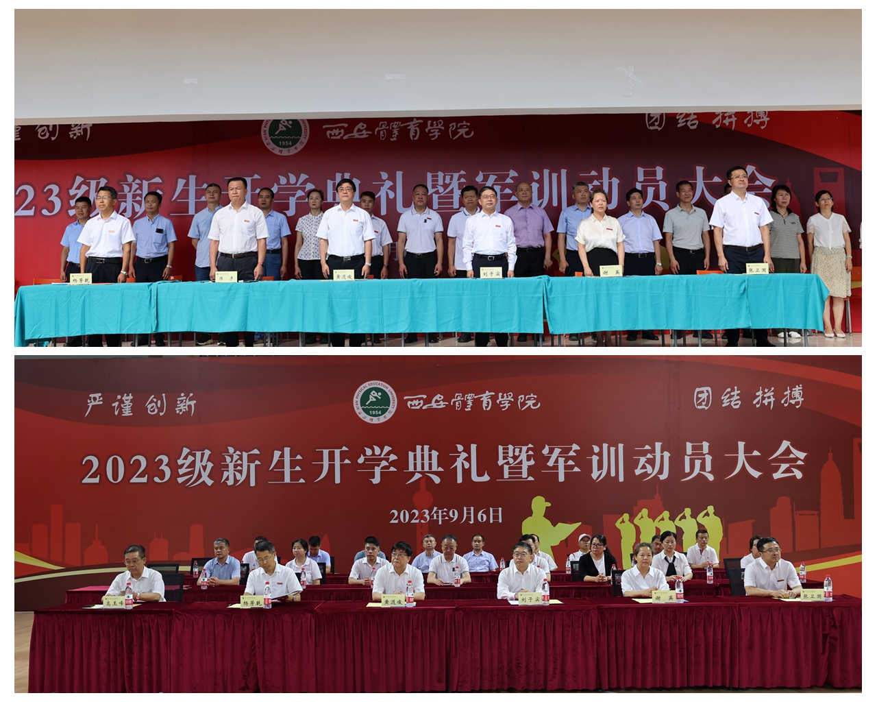 本网讯 9月6日,我校2023级新生开学典礼暨军训动员大会分别在含光校区第一田径场和鄠邑校区手球馆隆重举行。全体校领导出席,相关职能部门负责人及教师代表、军训教官代表和2023级新生辅导员、全体新生参加典礼。党委副书记杨芳乾和高玉峰分别在含光、鄠邑校区主持大会。