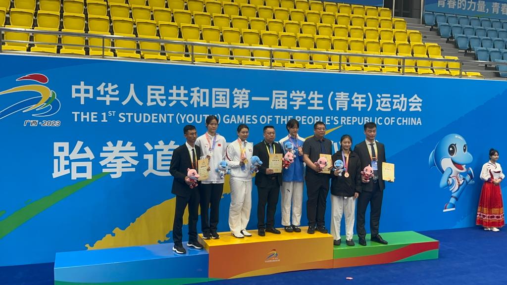 本网讯 10月23日至30日,第一届全国学生(青年)运动会(公开组)跆拳道项目决赛在广西举行。在与来自全国50个代表队的193名青年运动员的角逐中,我校运动员崔釜源获得男子+80KG第一名,吴杉杉获得女子-62KG第二名,肖海峰获得女子-73KG第二名,杨婉津获得女子-67KG第五名,束鑫获+78KG第七名的好成绩。我校李东华老师作为教练组成员之一随队参赛。