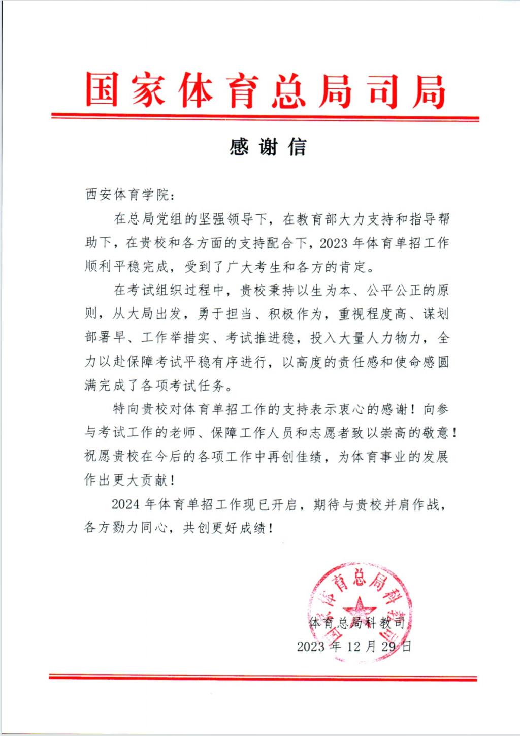 本网讯 近日,国家体育总局科教司致以一封感谢信,对我校在2023年度全国运动训练、武术及民族传统体育专业招生考试中出色完成的部分项目专项考试任务表示了诚挚的谢意和高度认可。