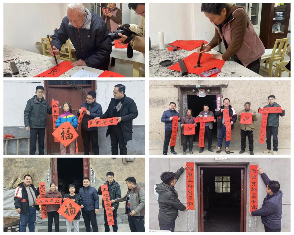 本网讯 为传承中华优秀传统文化,营造喜庆的节日氛围,在农历龙年即将到来之际,近日,我校乡村振兴工作驻村队联合校团委、离退休工作处开展了“迎新春、送春联、促振兴”活动,由驻村工作队把我校师生书写的饱含深情和祝福的春联送到谢坝村老党员、退伍军人及五保户家中,在村里营造出热闹欢乐的春节氛围。