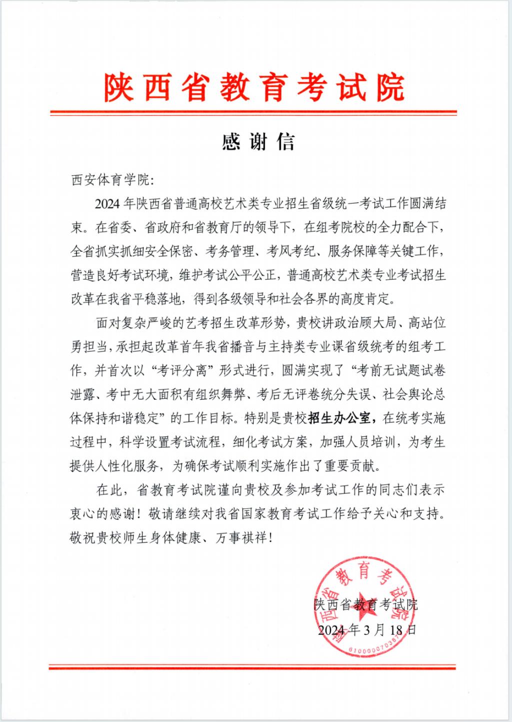 本网讯 近日,陕西省教育考试院致以一封感谢信,对我校在2024年陕西省普通高校艺术类专业招生省级统一考试工作中出色完成的播音与主持类考试任务表达了诚挚的感谢和高度认可。