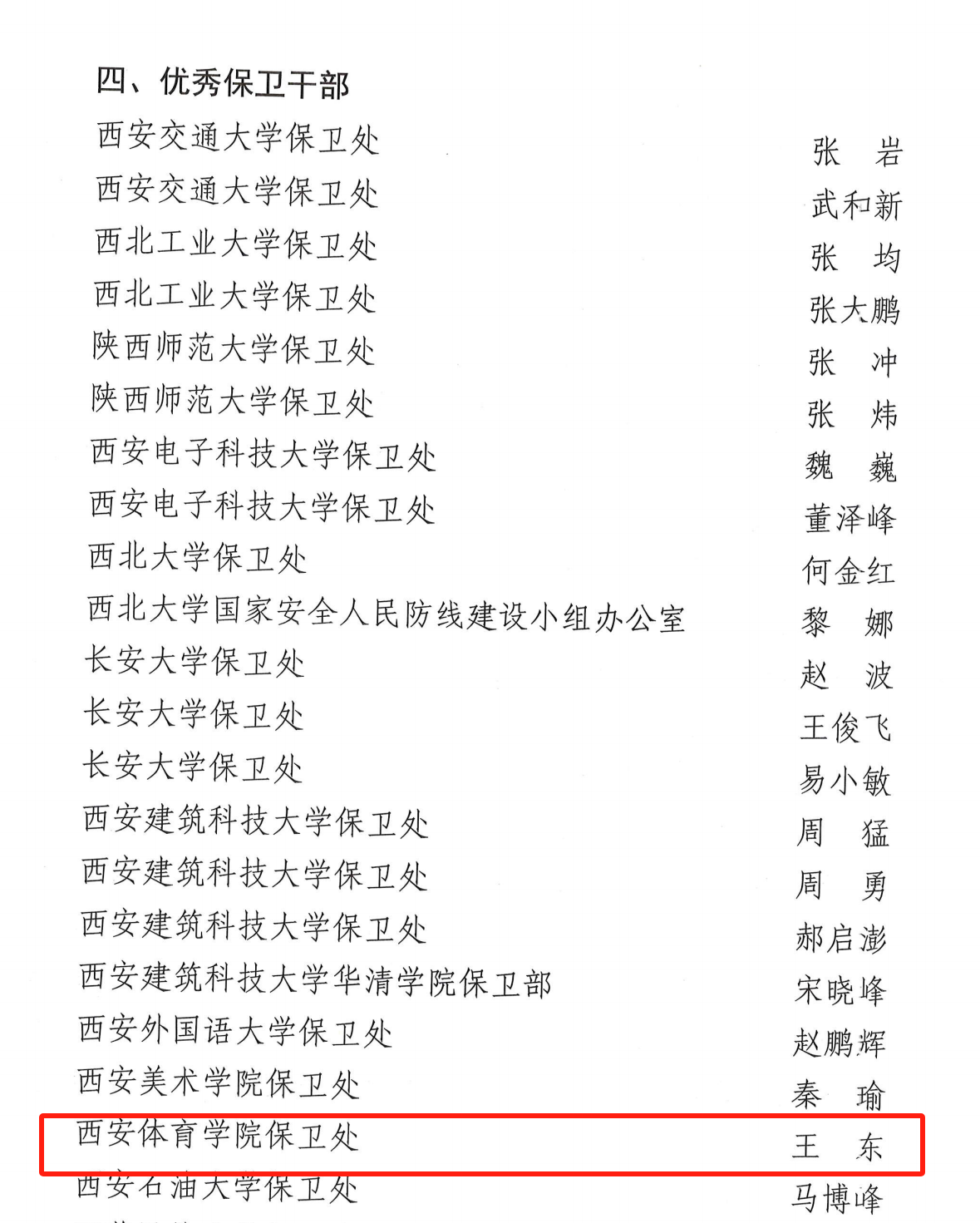 本网讯 近日,西安市公安局发布了《关于表彰2023年度文化保卫工作优秀集体和优秀个人的决定》,我校保卫处获“全市文化保卫工作优秀高校保卫处”称号,同时我校保卫处王东、祝博文同志被评为“优秀保卫干部”,李东亮、孙晓丹同志也被评为“优秀信息员”。