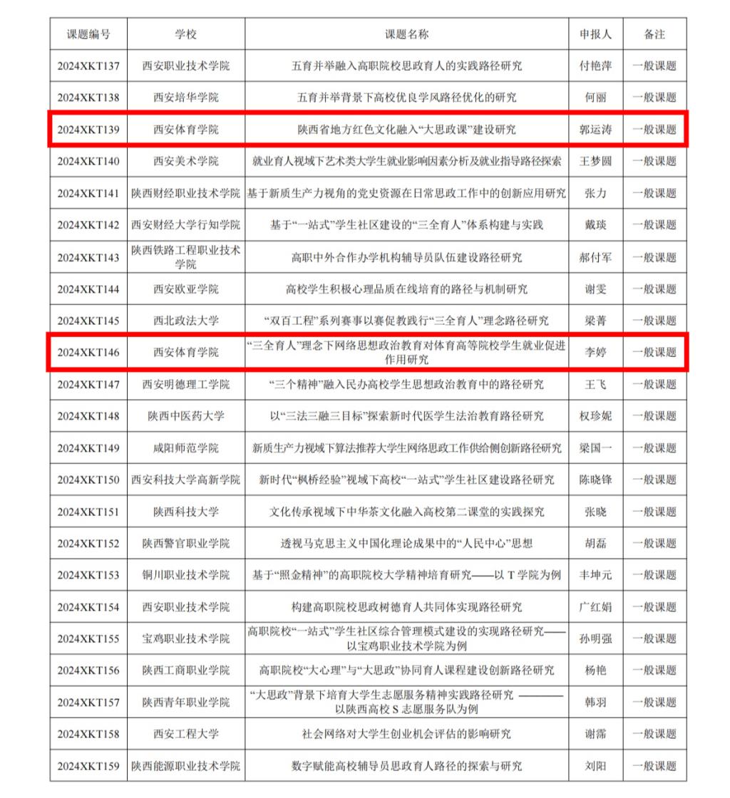 根据《中共陕西省委教育工委办公室关于开展2024年度陕西高校辅导员队伍素质能力提升工程系列活动的通知》(陕教工生办〔2024〕4号)精神,我校辅导员积极响应并参与,经过学校推荐、专家评审以及委厅审定,最终体育教育学院耿莉申报的《体育助残志愿服务赋能体育院校思想政治教育研究》获得重点课题项目立项;研究生部郭运涛《陕西省地方红色文化融入“大思政课”建设研究》、李婷《“三全育人”理念下网络思想政治教育对体育高等院校学生就业促进作用研究》获得一般课题项目立项。