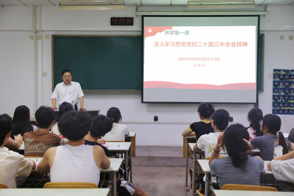 党委书记刘子实为体育新闻与传媒学院学生讲授了深入学习贯彻党的二十届三中全会精神的思政课,从党的二十届三中全会的重大意义、精神实质、核心要义和实践要求,对党的二十届三中全会精神进行了系统阐释,并结合国内国际鲜活事例和学校发展实际讲授了如何贯彻党的二十届三中全会精神,推进教育科技人才体制机制一体改革,提升办学质量,同时教育引导学生坚定理想信念、锐意进取、开拓创新,为中国式现代化建设贡献青春力量。