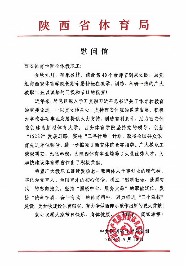 本网讯 在第40个教师节来临之际,国家体育总局、陕西省体育局发来慰问信,向辛勤耕耘在体育教育一线的广大教师、教育工作者致以诚挚问候和节日祝贺。