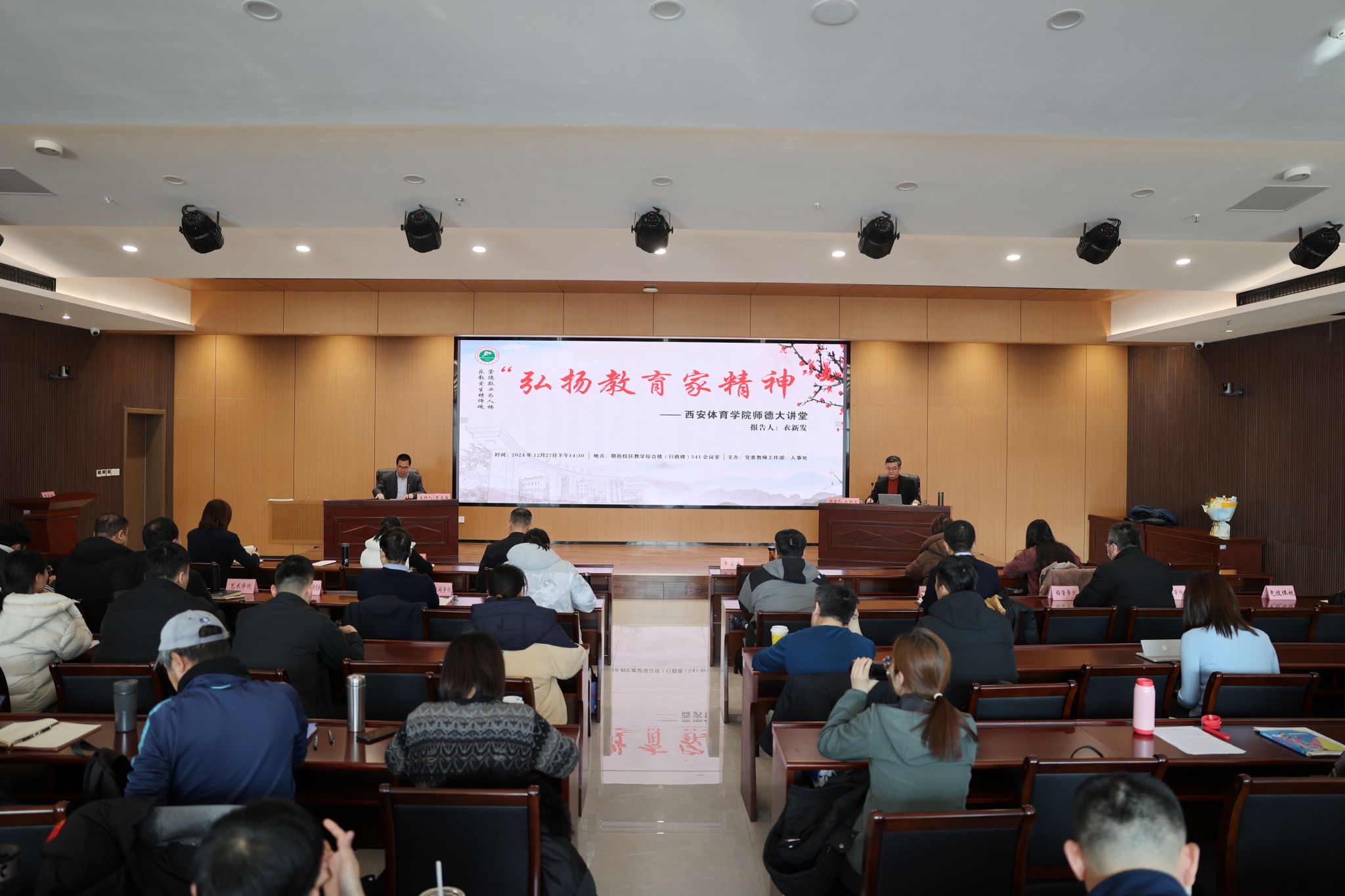 本网讯 12月27日下午,我校在鄠邑校区综合楼报告厅举行建校70周年系列活动暨“弘扬教育家精神”师德大讲堂第七场报告会,邀请到陕西师范大学衣新发教授作《弘扬教育家精神,争做时代“大先生”》专题报告,报告会由李富生校长主持,相关部门负责人及110名教师及辅导员代表到场聆听报告。