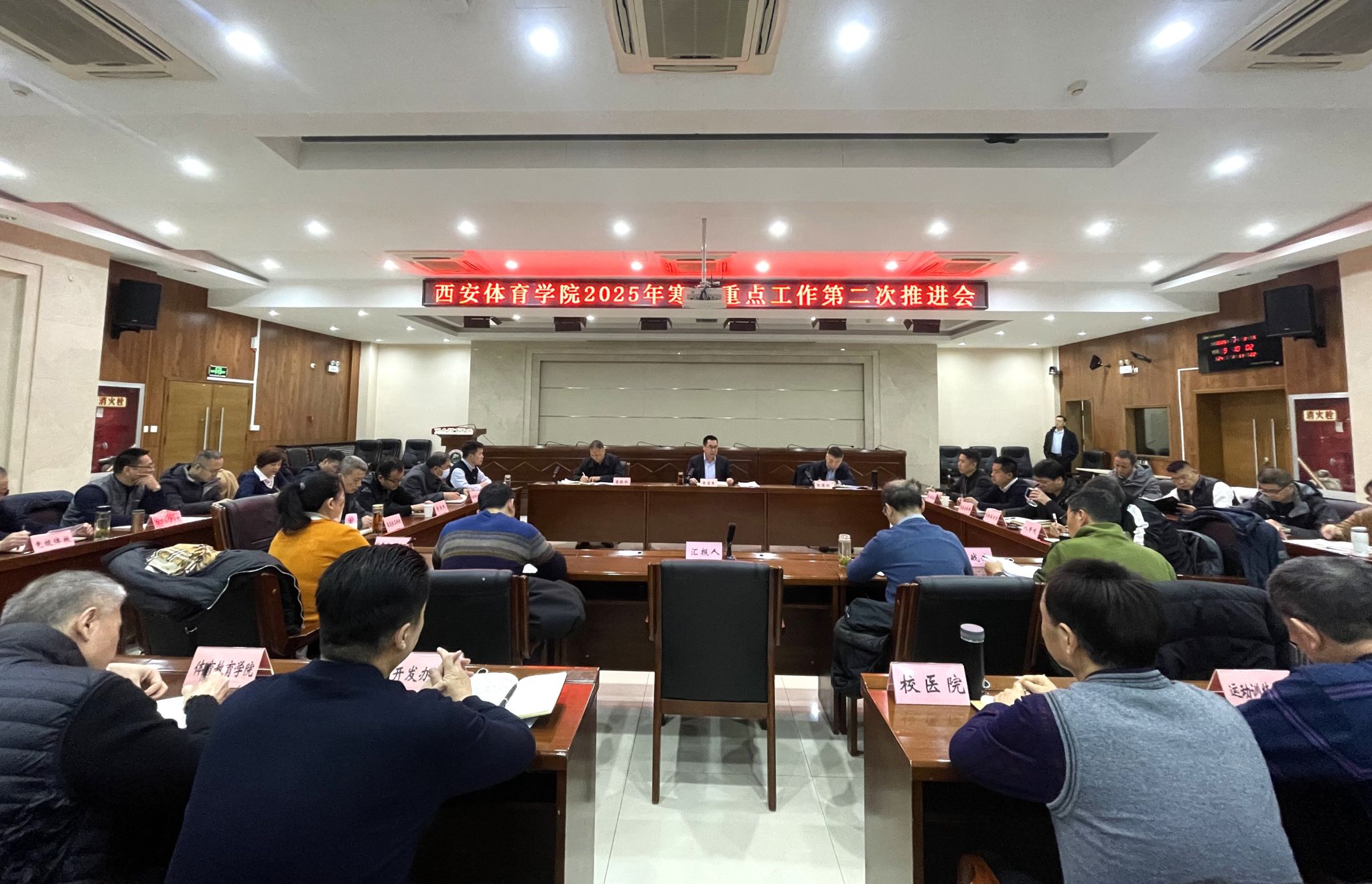 基建处,竞技体校、国资处、鄠邑校区管委会、人事处、财务处、开发办、保卫处、后勤处、继续教育学院、校医院依次汇报了含光校区消防整改危楼加固、竞校改革整体搬迁、创收造血等重点工作进展情况,张葆欣、雷振华进行了工作点评。