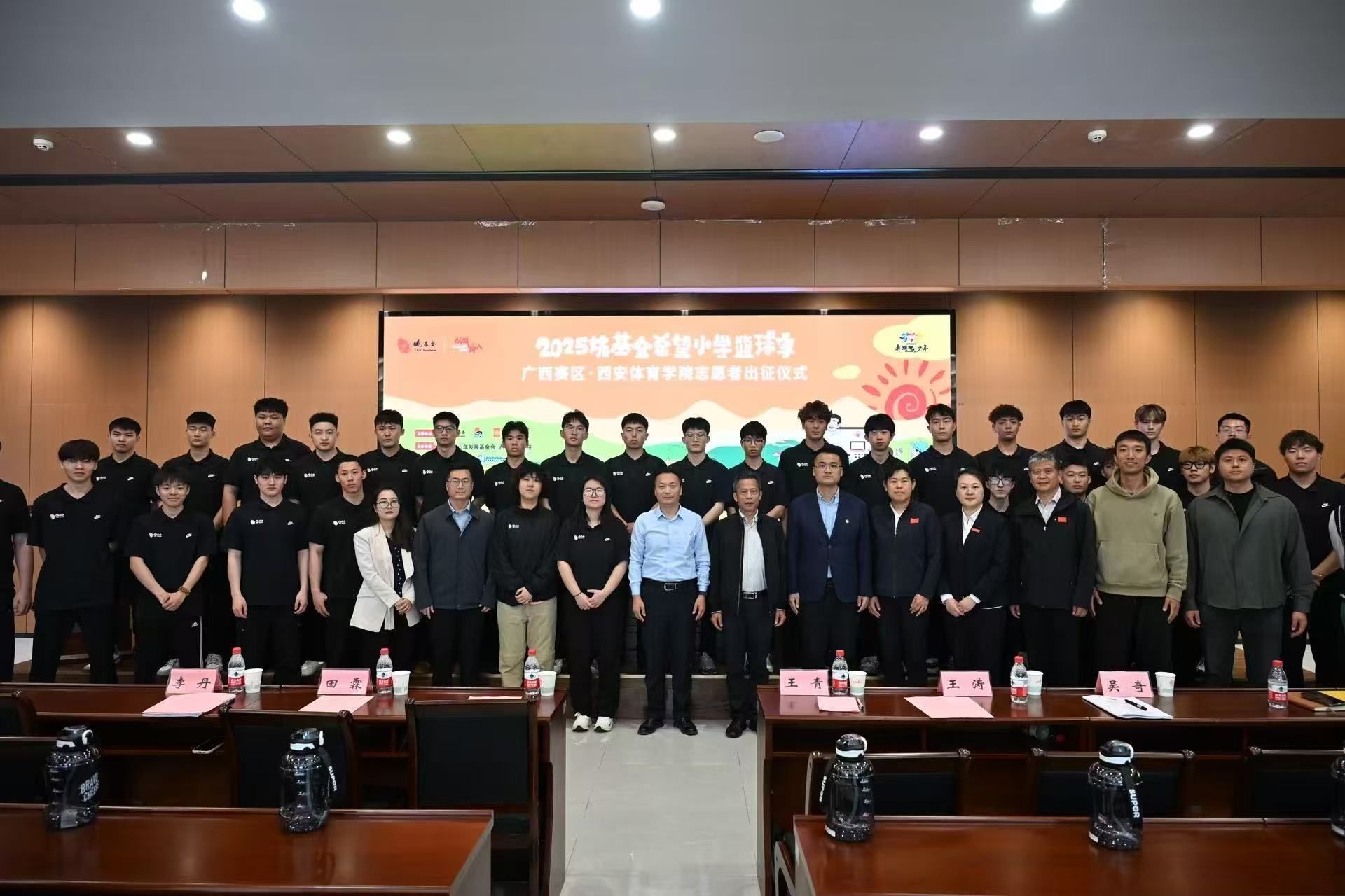 本网讯 4 月 11 日,2025年姚基金希望小学篮球季广西赛区支教志愿者出征仪式在我校鄠邑校区举行。党委副书记马海涛、北京姚基金公益基金会项目主管欧敏、广西青少年发展基金会副理事长黎传文出席,校内相关职能部门、二级学院负责人及辅导员、篮球支教培训教师以及2025 年姚基金支教志愿者参加仪式。