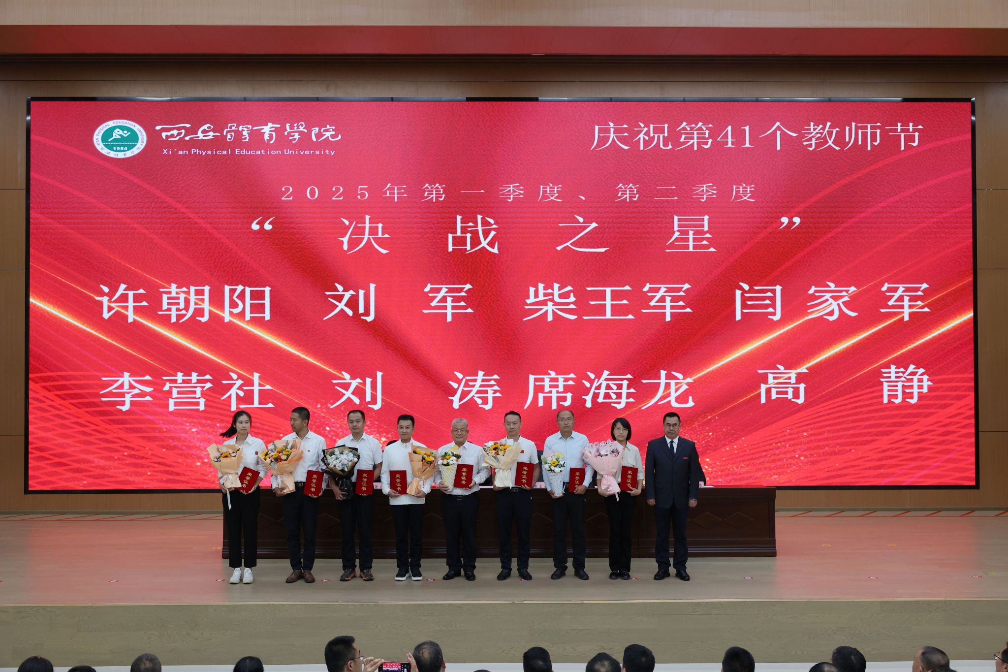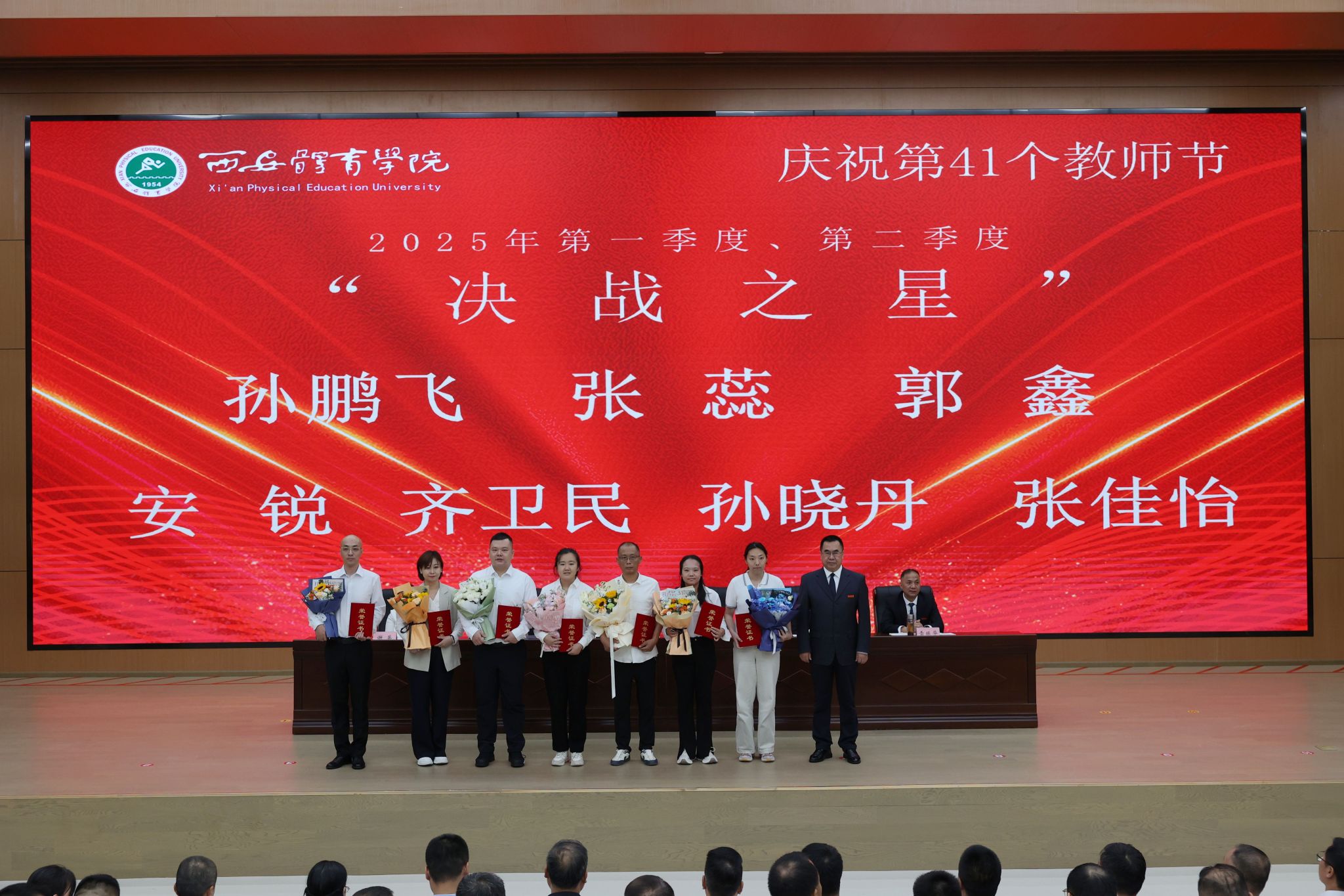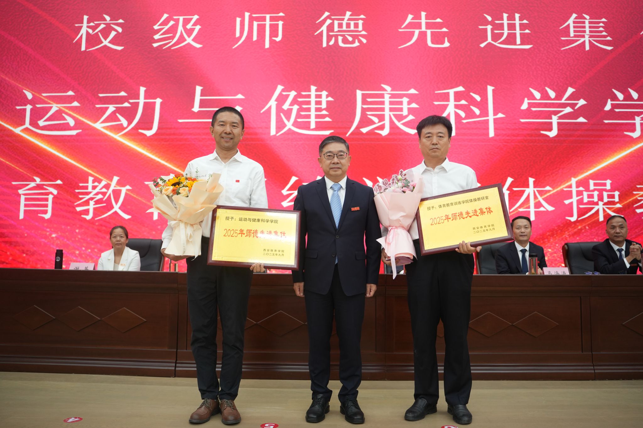 大会在庄严的国歌声中拉开序幕。党委副书记张卫国宣读表彰通报,对一年来在教学科研、育人管理、服务师生、校区建设等领域涌现出的先进集体与个人给予充分肯定。校领导依次为荣获“校级先进工作者(教学、科研、教练、省级人才)”“校级师德先进个人”“校级优秀辅导员”“西体最美教师”“2025年度第一、二季度‘决战之星’”“校级师德先进集体”等荣誉称号的集体和教职工颁发奖牌证书,充分体现了学校对教师队伍建设的高度重视与深切关怀。