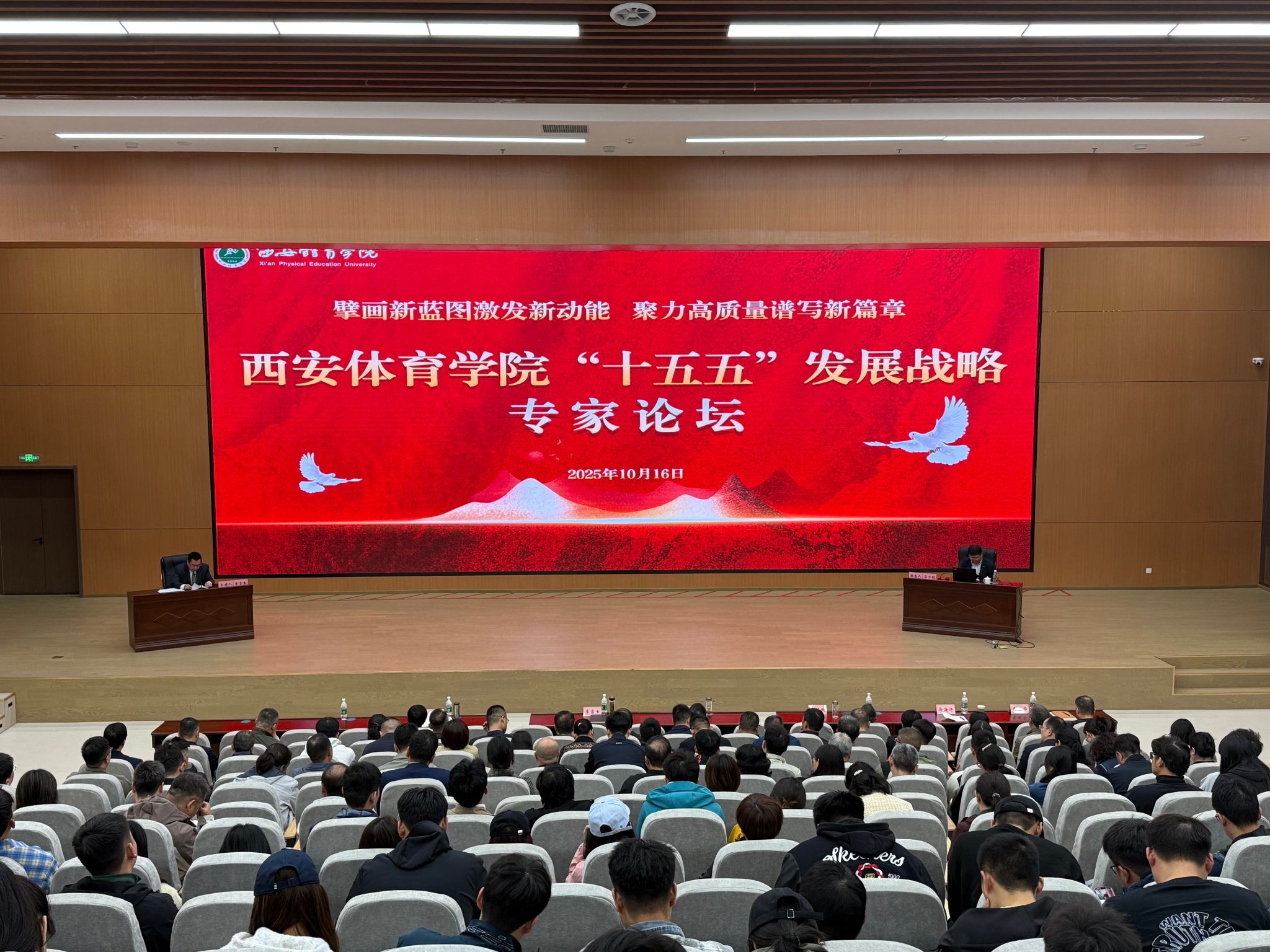 本网讯 为高质量谋划学校“十五五”发展,10月16日,我校在鄠邑校区举办“十五五”发展战略专家论坛。本次论坛以“擘画新蓝图激发新动能 聚力高质量谱写新篇章”为主题,邀请福建师范大学原党委书记黄汉升教授、上海体育大学原校长陈佩杰教授、武汉体育学院院长吕万刚教授来校作报告,为学校未来发展规划提供战略指导和智力支持。刘子实、李富生、杨芳乾、张卫国、马海涛、谢英、张葆欣、雷振华等校领导,副处级以上干部,学科学术带头人,发展规划与学科建设处、科研处、研究生部全体人员以及师生代表300余人参会。校长李富生主持论坛。