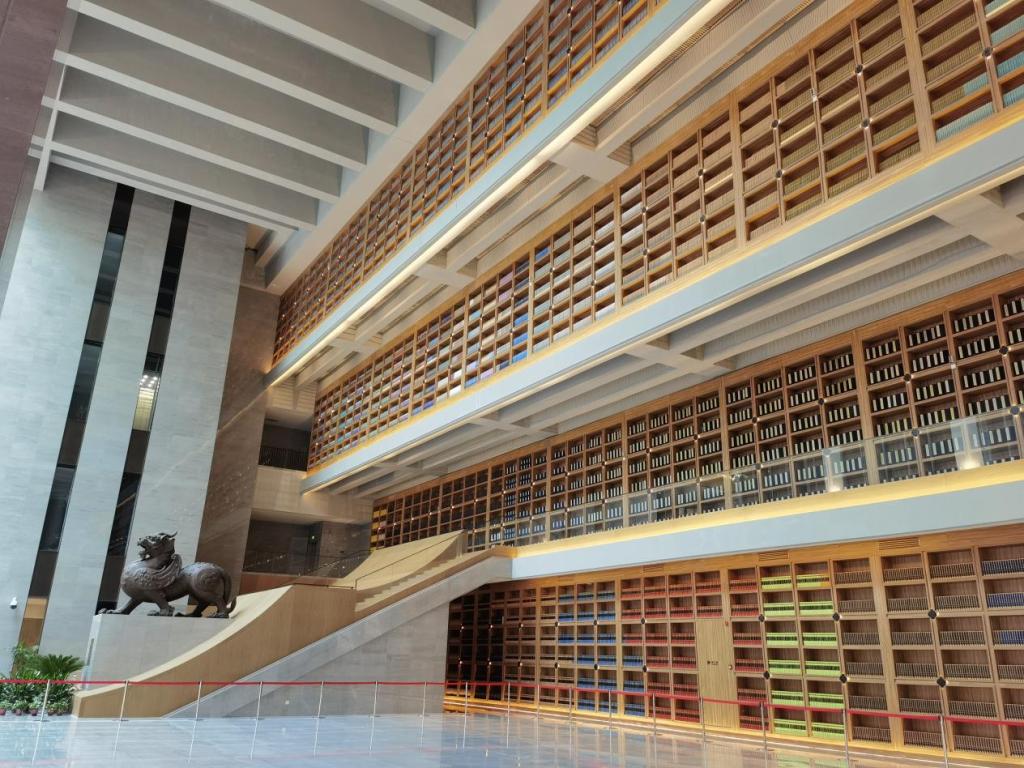 西安国家版本馆(中国国家版本馆西安分馆)南倚秦岭,北望渭河,占地约300亩,总建筑面积8.25万平方米,主体为高台建筑,呈现出大气磅礴的汉唐风格。
