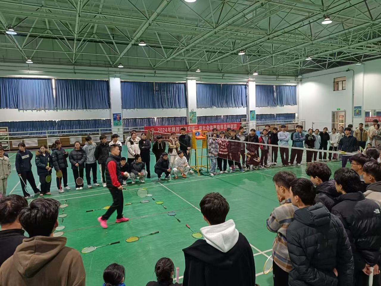 本网讯 近日,2024年陕西省羽毛球一级社会体育指导员培训班在我校含光校区举行。陕西省乒羽网运动管理中心副主任朱明皓出席并讲话,我校继续教育学院院长朱军参加,副院长纪伟主持,160名羽毛球专项学生及运动员分批接受了理论、专项技能实践培训。