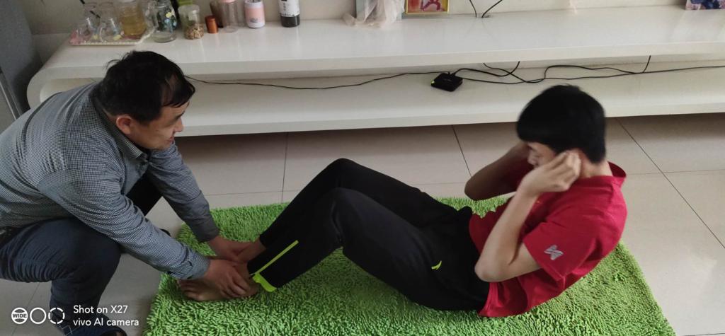 二、训练内容丰富化。蹦床队结合KEEP应用,开展腹肌雕刻、腹肌撕裂者强化、弓步走、俯卧撑等训练内容;攀岩队和散打队结合项目特点,根据各队员家里不同环境开展倒立俯卧撑、仰卧起坐、引体向上等训练内容。