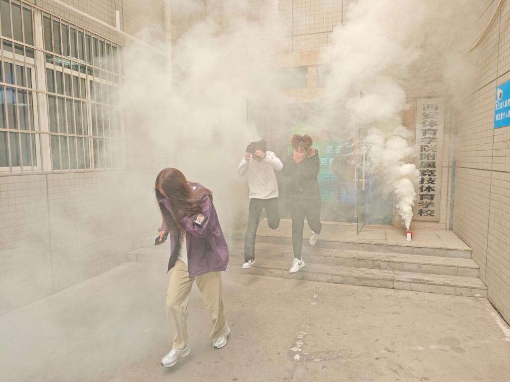 随着党总支书记王刚一声令下,演练正式开始。学生公寓6#楼出现不明原因的“火情”,浓烟迅速向楼道蔓延,消防疏散立即展开,竞技体校相关工作人员按照活动预案从高往低逐层疏散学生。学生们用毛巾捂住口鼻,弯腰低姿,按照疏散线路从安全出口冷静有序、迅速撤离至指定地点。整个过程紧张有序,用时3分38秒,达到了演练预案预期效果。
