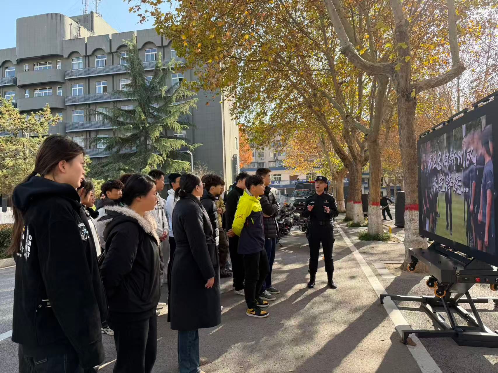 在支队引导员的带领下,同学们首先来到了训练场一号区域。这里停放的多功能、高科技特种车辆立刻吸引了大家的目光,特警队员对各类车辆的性能和用途进行了专业讲解。随后,同学们观看了新训队的训练集锦视频,视频中队员们在高强度、高标准下刻苦训练的画面,淋漓尽致地展现了特警“特别能吃苦、特别能战斗”的精神风貌,令观者动容。