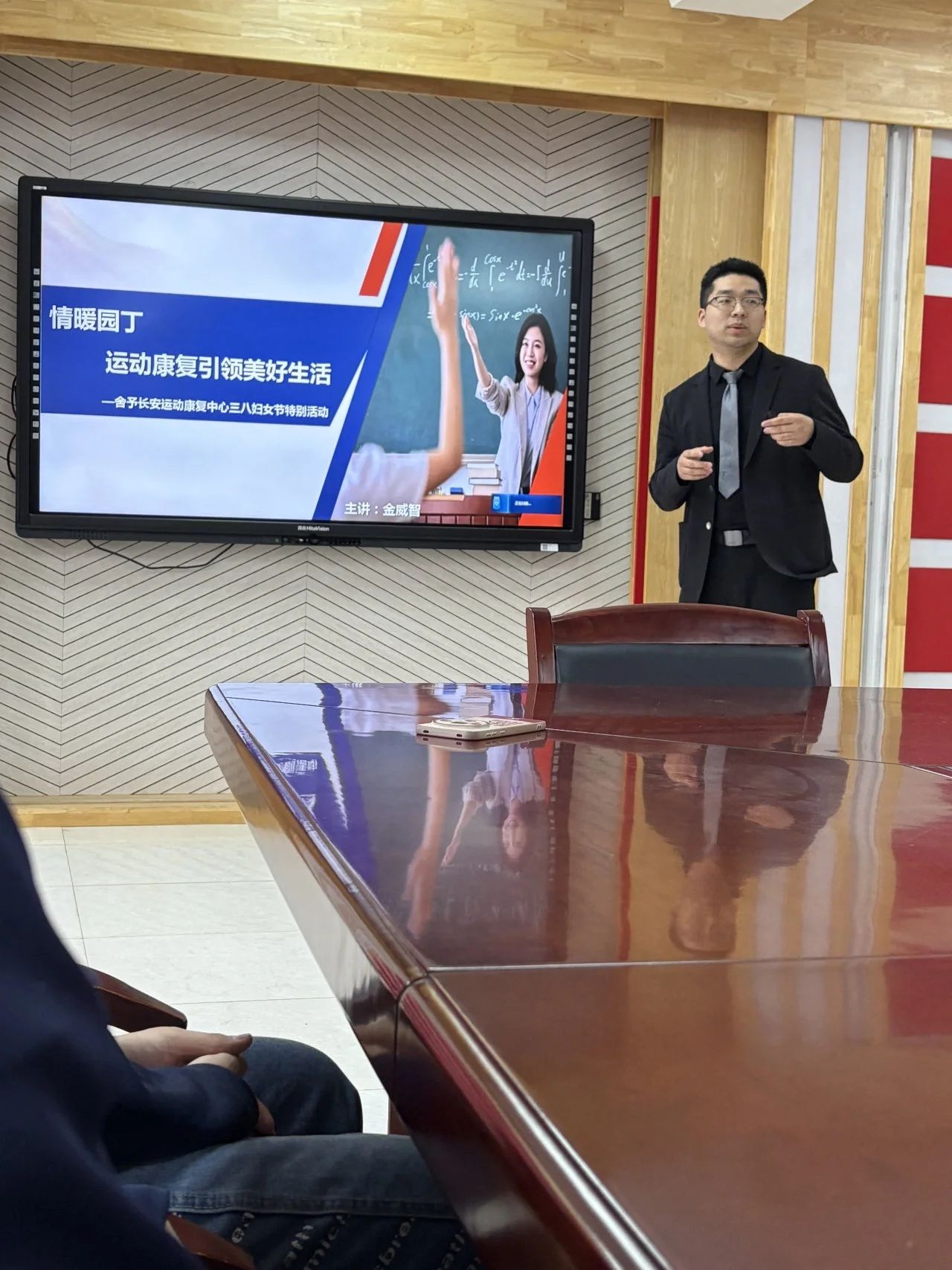 康保现任会长陈文杰、王昱彬、蔡青、商子茉在台上为老师们带来可以缓解疼痛疲劳的颈椎操,一步一步仔细讲解和演示,恢复正常人体颈椎的生理曲度、促进血液和淋巴循环,缓解颈部肌肉僵硬,老师和同学们纷纷积极配合,事后也表示效果显著!
