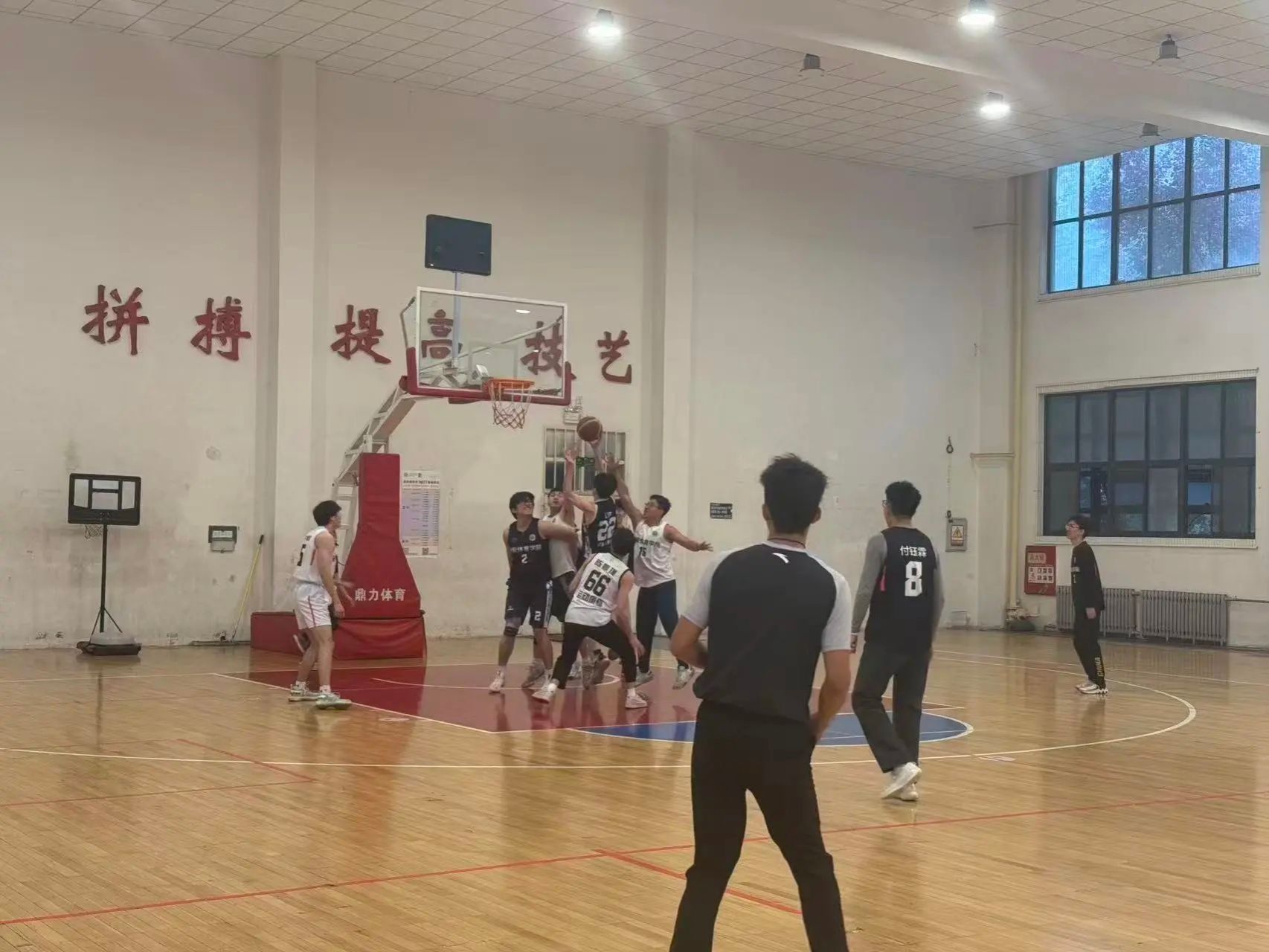 “融新杯”篮球赛已经来到第六天了,虽然天下小雨,但仍然无法阻止同学们的活力与热情。