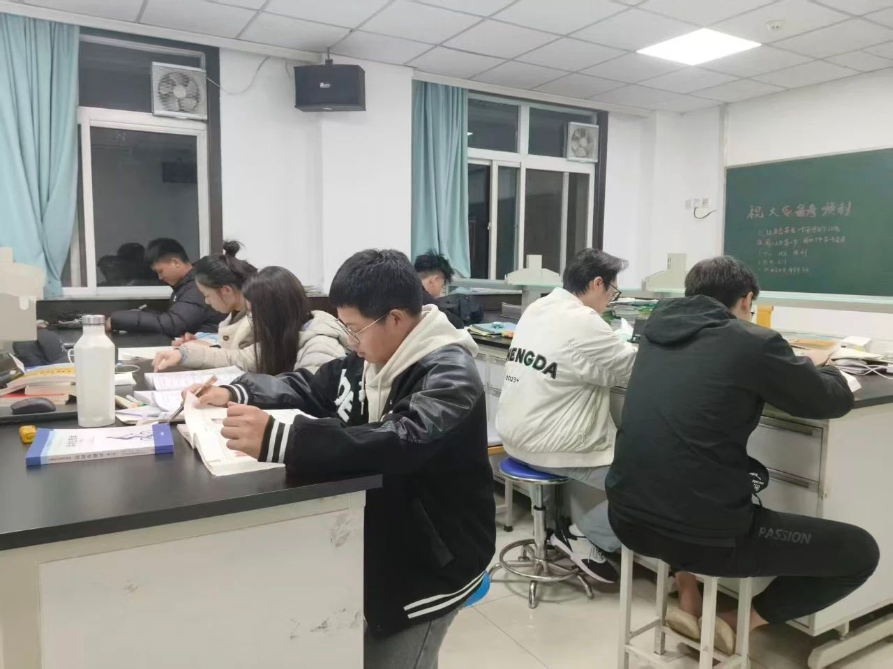 这份专注的背后,藏着运动与健康科学学院最坚实的支撑。为了给考研学子打造专属的"研途驿站",学院特意开放了实验楼207教室作为专用自习室,明亮的灯光、整洁的桌椅、安静的环境,让大家无需为抢占座位奔波,能全心投入复习 。学院延长了自习室开放时间,从清晨到深夜,这片空间始终为逐梦人亮着灯。在这里,每个人都在与时间赛跑,用专注对抗焦虑,用坚持书写希望。