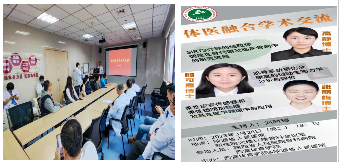 2023年3月28日晚上六点半,由西安体育学院和陕西省人民医院骨科病院联合主办的体医融合学术交流科研报告会,在陕西省人民医院住院楼17楼骨科病院会议室召开。运动与健康科学学院苟波、潘玮敏两位教授和高静、殷可意、张丽梅、曹怡炜、张志勇等五位青年教师,以及陕西省人民医院骨科专家学者共计三十余人参加了学术交流。会议由陕西省人民医院骨科病院刘时璋主任主持。