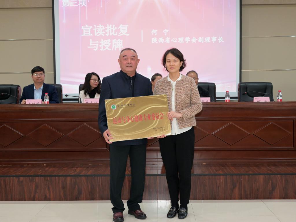 陕西省心理学学会副理事长何宁宣读学会批复并授牌;天津师范大学副校长、中国心理学会常务理事白学军,教育部学位中心全国心理学学科评议专家魏高峡等为专委会主任委员、副主任委员、秘书长颁发聘书;陕西省心理学会运动与身心健康专业委员首任主任委员李靖教授做表态发言。成立大会由西安体育学院运动与健康科学学院院长刘涛主持。