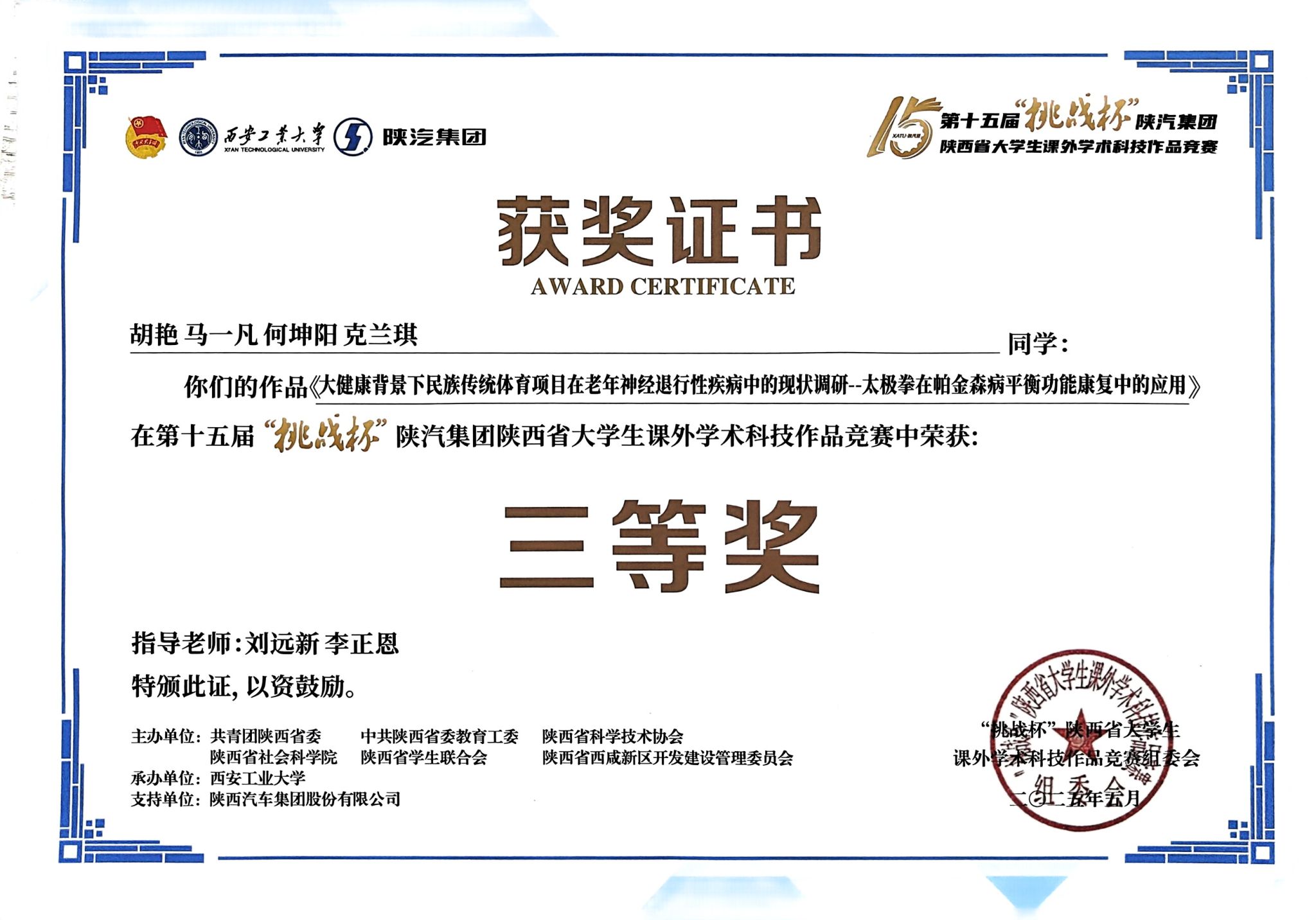 近日,第十五届“挑战杯”陕汽集团陕西省大学生课外学术科技作品竞赛在西安圆满落幕。来自西安体育学院运动与健康科学学院的胡艳、马一凡、何坤阳、克兰琪同学凭借作品《大健康背景下民族传统体育项目在老年神经进行性疾病中的现状调研—太极拳在帕金森病平衡功能康复中的应用》荣获三等奖。