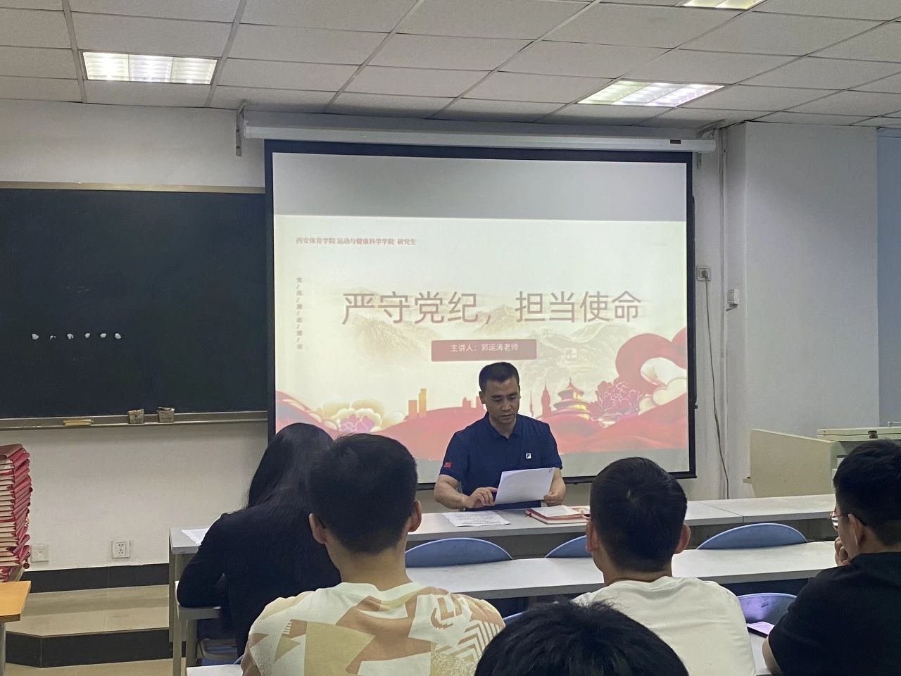为扎实推动党课学习教育,深入学习贯彻习近平新时代中国特色社会主义思想,于2024年6月11日下午18:00在研究生楼109教室,由运动与健康科学学院研究生学生党支部书记郭运涛老师主持,对运动与健康科学学院全体研究生学生党员展开线下集中党课学习教育。
