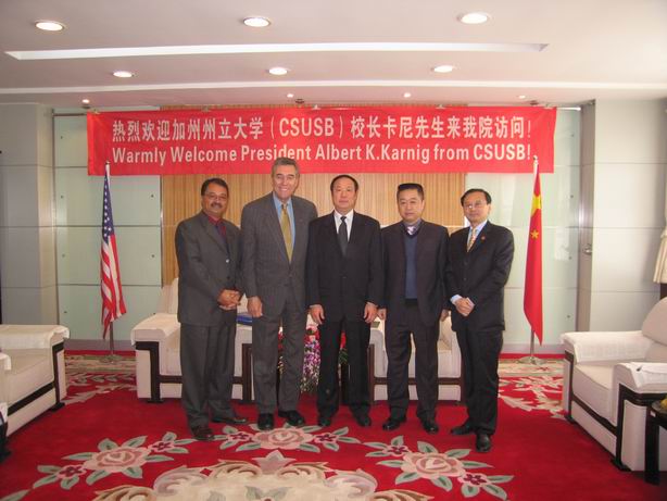 4月2日美国加利福尼亚州州立大学圣伯纳迪诺分校(CSUSB)校长卡尼格先生与该校继续教育学院院长乔伊博士一行二人来我院进行友好校际访问。该校与我院于今年二月份在美国签署了合作备忘录,卡尼格校长此为第一次来我院访问,双方就有关具体合作事宜进行进一步商谈。
