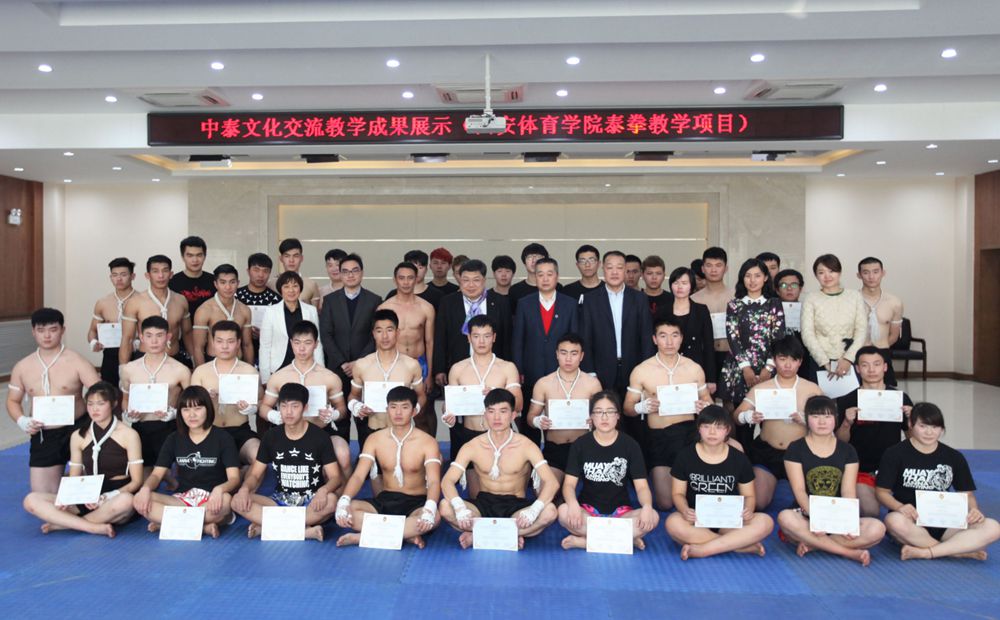 随后,我院与泰方互赠了纪念品。参加此次交流活动的泰拳教练和我院武术系学生还进行了精彩的泰拳表演,引来了全场观众的热烈掌声。苏提瓦还为参加本次交流活动的我院40位同学颁发证书。