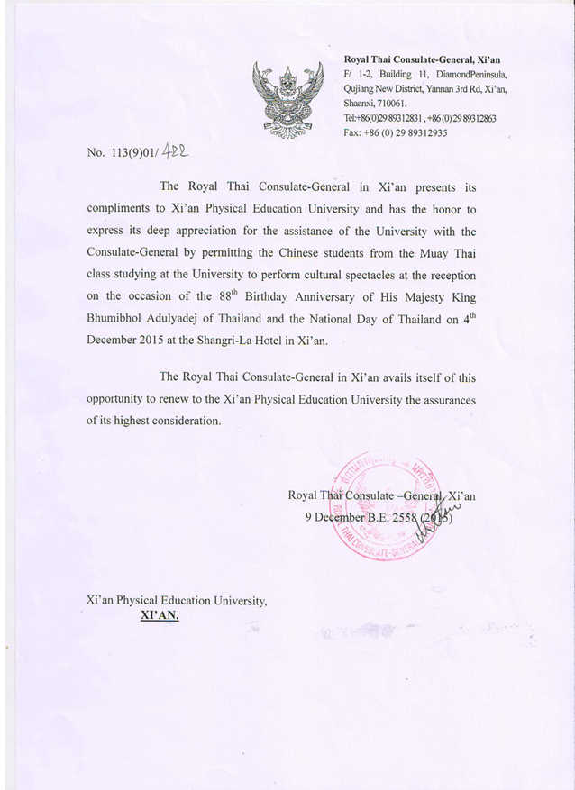 2015年12月4日,泰国驻西安领事馆于举办了庆祝泰国国王生日暨泰国国庆日活动,我院学生应邀参加了泰拳艺术表演活动,此次活动圆满成功,泰王国驻西安领事馆专门发来感谢信,以表达对我院学生艺术表演的感谢。